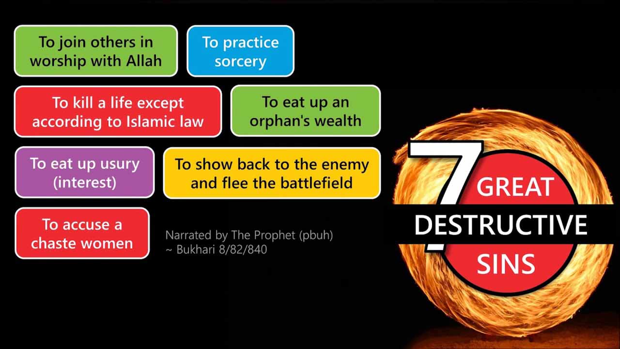 Avoiding the above-mentioned destructive sins is a great act that every believer should commit to. To avoid these major sins, Muslims need to study carefully each of these destructive sins to see if one might be doing them unexpectedly and try to take all means to avoid them accordingly.