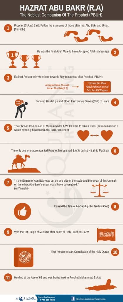 Hazrat Abu Bakr (RA) was born in a highly respected family of Banu Tamim of the tribe of Quraish in Makah in 573 A.D. He (RA) was the son of Uthman commonly known as Abu Quhafa; Hazrat Abu Bakr (RA) lived his life as a Merchant in Makah. Abu Bakr (RA) was first of the men who accepted Islam when Prophet (SAW) started preaching Islam. He (RA) was also known as the closest and best companion of Prophet Muhammad (SAW) from his youth. He was indeed the first adult male to accept Islam.