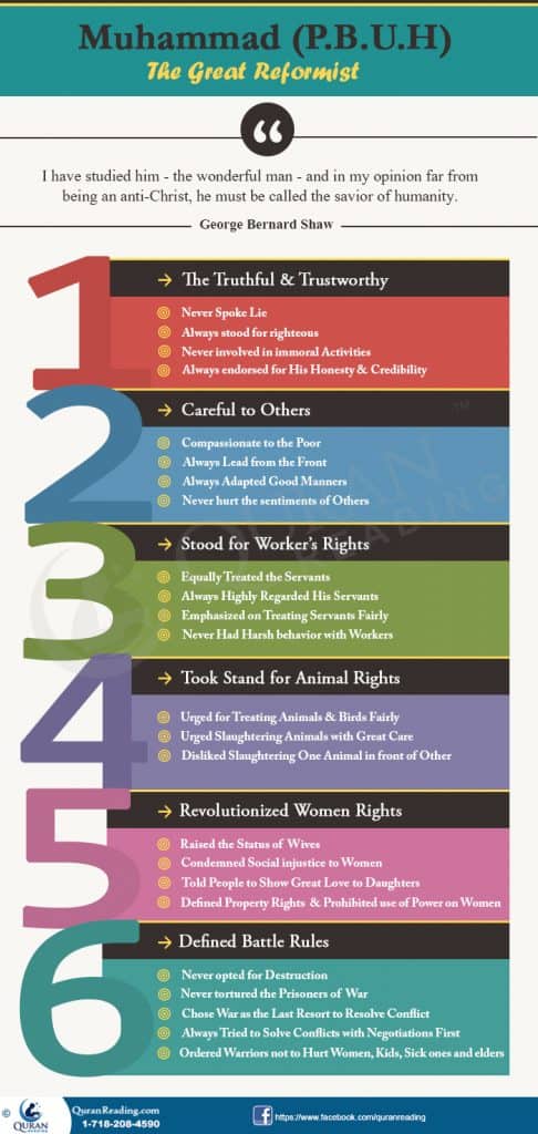 Prophet Muhammad (SAW) is the finest example of a perfect man in all aspects of life for everyone. The Almighty Allah distinguished him from all and varied by inspired in his divine personality and exceptional qualities such as modesty, truthfulness, kindness, patience, loyalty, honesty, courage, bravery, generosity, wisdom and the like. Allah the most Glorious direct upon us to take the Prophet (SAW) behavior as an example, because he guides us to virtue and righteousness and we should follow his Sunnah and we can learn these things from the history of Prophet Muhammad (SAW):
