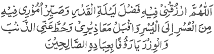 Translation: “O Allah, on this day, bestow on me the blessings of Laylatul Qadr, change my affairs from (being) difficult to (being) easy, accept my apologies, and decrease for me [my] sins and burdens, O the Compassionate with His righteous servants.”