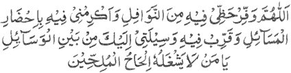 Translation: “O Allah, on this day, grant me a share in its nawafil (recommended prayers), honor me by attending to my problems, make closer the means to approach You, from all the means, O One who is not preoccupied by the requests of the beseechers.”
