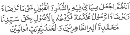 Translation: “O Allah, on this day, make my fasts worthy of appreciation and acceptance, according to what pleases You, and pleases the Messenger, the branches being strengthened by the roots, for the sake of our leader, Muhammad, and his purified family. Praise be to Allah, the Lord of the worlds.”