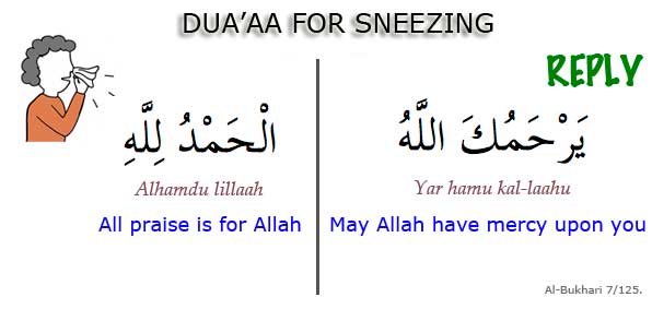“If anyone of you sneezes, he (she) should say”Alhamdulillah” (Praise be to Allah) and his brother or his companion (i.e. one who is with him/her) should say ‘’Yarhamuk Allah’’ (May Allah have mercy on you). When the latter says ‘’Yarhamuk Allah,” the former should say ‘’Yahdikumullah, wa yuslihu balakum’’ (May Allah guide you and set your affairs straight).” (Bukhari)