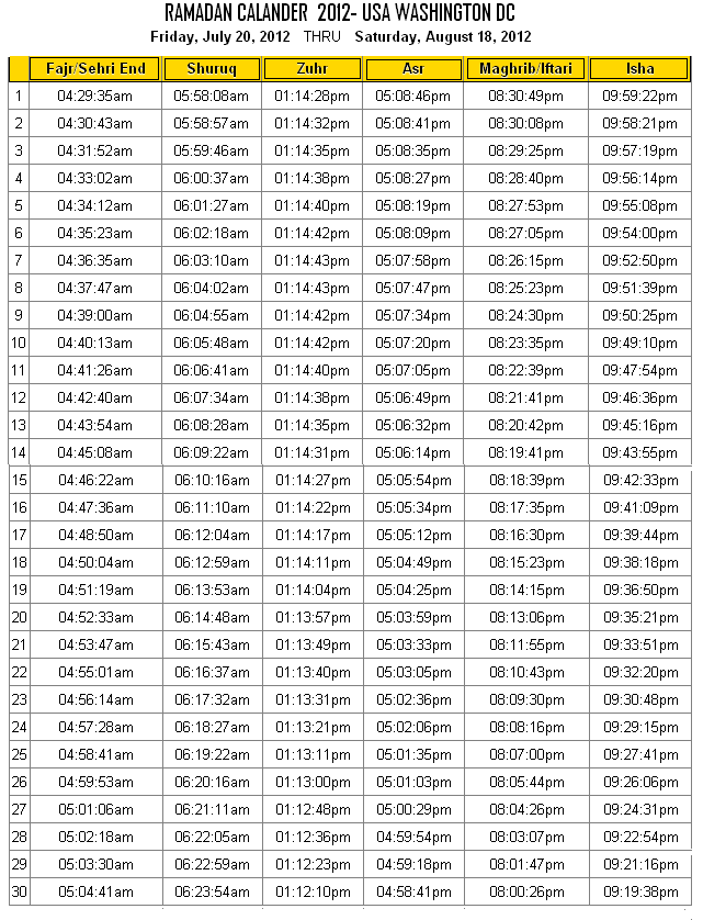 According to the Islamic Calendar, month of Ramadan have been started from Friday which is July 20, 2012 and the Eid-ul-Fitr will be celebrated on August 19, 2012 (Expected) in USA in the year 2012. It is better to end the Sehri or Suhoor 5 minutes earlier than the start of Fajr prayer. Given below are the Ramadan timings that show the prayers time from the month of Ramadan 1 to 30 in the city of Washington DC in USA.